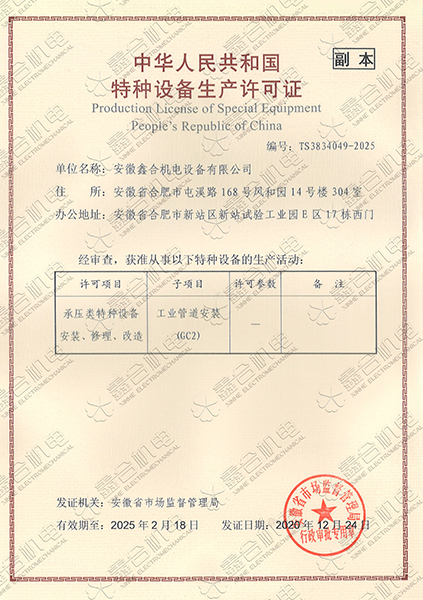目前我公司具有建筑機電安裝工程專業(yè)承包一級資質(zhì)、總承包二級、GC2壓力管道設(shè)計、施工資質(zhì)。現(xiàn)有高級工程師5名、高級技師55名、工程師22名、助工25名、技術(shù)員22名、各類專業(yè)技師50多名,強大的技術(shù)力量及精良的施工隊伍,為客戶提供全方位服務(wù)。 公司本著“一切為了用戶”的經(jīng)營理念,“以品質(zhì)求生存、以誠信贏市場、以管理促發(fā)展”為要求,努力為廣大客戶提供專業(yè),優(yōu)質(zhì)、高效的服務(wù)。